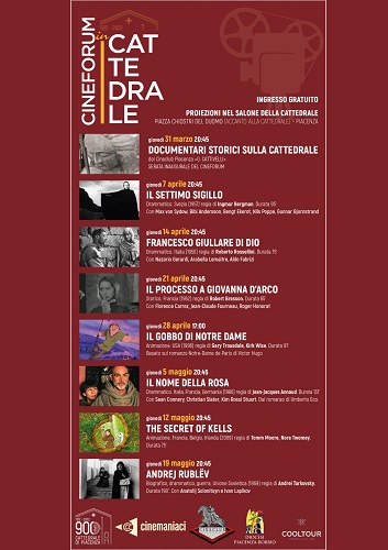 PIACENZA – Giunge al terzo appuntamento Giovedì 21 aprile alle 20.45 la rassegna cinematografica “Cineforum in Cattedrale”, organizzata dalla Diocesi di Piacenza – Bobbio in collaborazione con la cooperazione Cooltour, l’associazione culturale Cinemaniaci e il Cineclub “G. Cattivelli” di Piacenza. Il film in programmazione Giovedì 21 aprile 2022 alle ore 20.45 è “Processo a Giovanna d’Arco”, regia di Robert Bresson, con Florence Carrez, Jean-Claude Fourneau, Roger Honorat. Genere storico – Francia, 1962, durata 95 minuti.