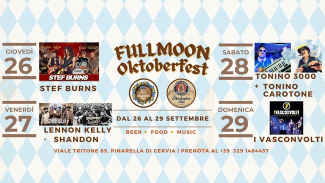Il calendario dell’Oktoberfest, che quest’anno avrà come birra ufficiale la bavarese Paulaner e Hacker Pshorr, proseguirà poi venerdì 27 settembre con i concerti dei cesenati Lennon Kelly e degli Shandon (gruppo ska punk che celebrerà i suoi primi 30 anni), mentre il sabato sera toccherà a Tonino 3000 e Tonino Carotone (disco d’oro con l’album “Mondo difficile”). Gran finale domenica 29 settembre con il live dei Vasconvolti, tribute-band del grande Blasco (info e prenotazioni tavoli al 329 1464457).