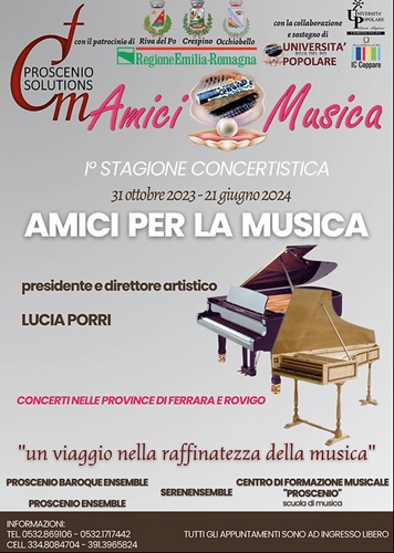 RIVA DEL PO (FE) – Si apre il 31 ottobre 2023 a Riva Del Po la I Stagione Concertistica dell’Associazione Amici perLa Musica APS – Centro di Formazione Artistica e Musicale Proscenio (Scuola di Musica) che inaugura così il suo 5° anno di attività.
