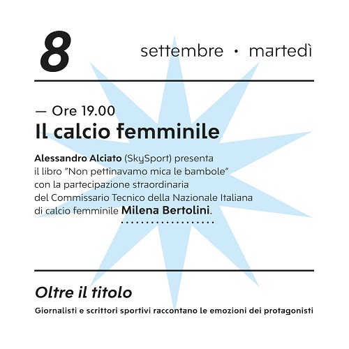 L’appuntamento, fissato per le 19 di martedì 8 settembre 2020 in Piazza della Liberta a San Marino, rientra nel programma della rassegna “Oltre il Titolo” organizzata dalla Segreteria di Stato per lo Sport e l’Informazione durante la settimana che porta al Gran Premio di San Marino e della Riviera di Rimini della MotoGP e che coinvolge scrittori e giornalisti, molti dei quali provenienti da Sky Sport e i loro ospiti. Si comincia martedì 8 con il calcio femminile la cui immagine è definitivamente esplosa grazie a Milena Bertolini e alle ragazze della Nazionale dopo il Mondiale femminile di Francia 2019.