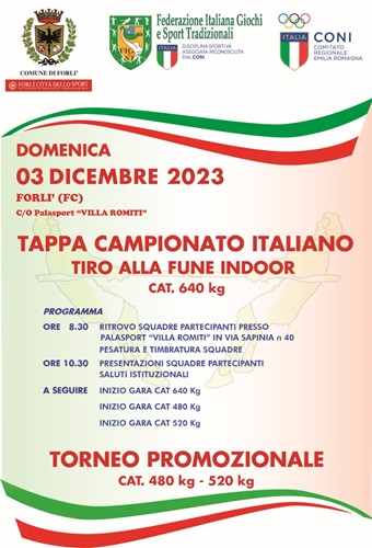 FORLÌ – I professionisti del tiro alla fune tornano a stringere la corda e a sfidarsi per la seconda gara valevole per il Campionato italiano indoor. L’appuntamento, patrocinato dal Comune di Forlì, città che ospiterà l’evento, e dal Coni Emilia Romagna, si terrà al Palasport Villa Romiti domenica 3 dicembre.