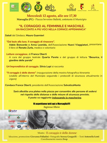 CORTE BRUGNATELLA (PC) – Continua da parte dell’associazione piacentina NUOVI VIAGGIATORI il viaggio esplorativo del nostro Appennino, alla ricerca di una narrazione che ne evidenzi, anziché le presunte ‘marginalità’, l’altissimo valore in termini di risorsa. Ci si sposta a Marsaglia, mercoledì 12 agosto, con inizio alle ore 17.30, con un ricchissimo programma di testimonianze sul coraggio. “Il coraggio al femminile e al maschile” è infatti il titolo dell’intero pomeriggio, organizzato in rete con altri soggetti, che vedrà alternarsi, nella piazza antistante la sede municipale, tante voci narranti su un tema che, causa i mesi drammatici che abbiamo alle spalle, torna prepotentemente in scena.