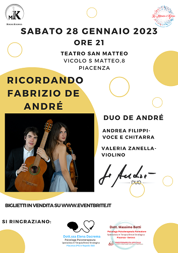 PIACENZA – Sabato 28 Gennaio alle ore 21 si terrà al Teatro San Matteo di Piacenza il concerto Ricordando Fabrizio De Andrè organizzato dall’Associazione Mikrokòsmos e da La Musica è Gioia di Francesca Raimondi, direttrice artistica del concerto.