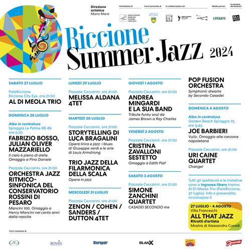 Tutti gli spettacoli e le iniziative di Riccione Summer Jazz 2024 sono a ingresso libero, tranne Al Di Meola Trio (27 luglio, PalaRiccione: info e prevendita su riccionejazz.it).