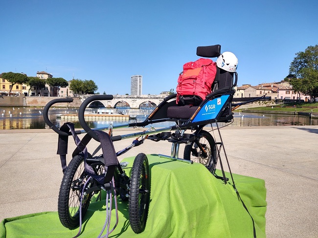 RIMINI – Una nuova Joëlette per la sezione riminese del CAI- Club Alpino Italiano. Alla piazza sull’acqua adiacente al ponte di Tiberio venerdì 28 maggio si è svolta una piccola cerimonia durante la quale Lorenzo Pastesini, direttore commerciale del Gruppo SGR, ha donato la speciale carrozzina affidandola al presidente del CAI Rimini Mauro Campidelli. Alla donazione è intervenuta anche l’assessora all’Ambiente del Comune di Rimini, Anna Montini.