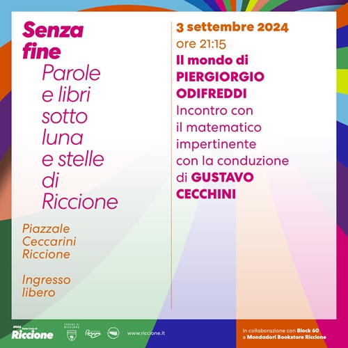 RICCIONE (RN) – Martedì 3 settembre (ore 21,15), il tour letterario di “Senza fine” chiude l’edizione 2024 con “il matematico impertinente” Piergiorgio Odifreddi, autore di numerose pubblicazioni di divulgazione scientifica, storia della scienza, filosofia, politica, religione, esegesi, filologia e saggistica varia.
