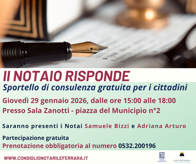 FERRARA – Si terrà giovedì 29 gennaio, dalle 15:00 alle 18:00, nel Municipio di Ferrara, il primo appuntamento dell’anno de Il notaio risponde, lo sportello gratuito di ascolto e consulenza che continuerà anche per tutto il 2026, e darà modo ai cittadini, l’ultimo giovedì di ogni mese, di rivolgere quesiti ai notai del Distretto e tecnici del Comune