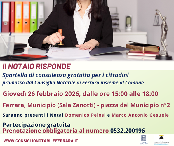 FERRARA – Si terrà giovedì 26 febbraio 2026, dalle 15:00 alle 18:00, nella residenza municipale di Ferrara, il secondo appuntamento dell’anno con Il notaio risponde, lo sportello gratuito di ascolto e consulenza promosso dal Consiglio Notarile in collaborazione con il Comune di Ferrara.