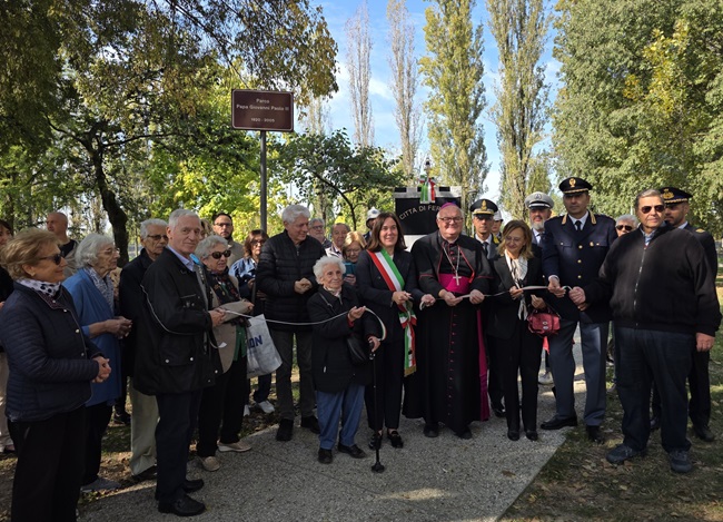 FERRARA – Ferrara omaggia San Giovanni Paolo II, Papa, nel 35esimo anniversario della storica visita del Pontefice nel nostro territorio. Da oggi, l’area verde di via Costanza Monti Perticari, già al centro dell’Operazione Parchi Sicuri avviata nel precedente mandato, sarà per sempre dedicata alla memoria di Papa Wojtyla. Alla riqualificazione del parco, su cui l’Amministrazione comunale ha stanziato 450mila euro di risorse proprie, si aggiunge oggi un altro passaggio altamente simbolico, che risponde alle richieste della cittadinanza. La richiesta di intitolazione, infatti, è giunta dall’Aps Progetto San Giorgio e approvata dalla Giunta dopo la proposta ufficiale avanzata dal Gruppo Consiliare della Lega.
