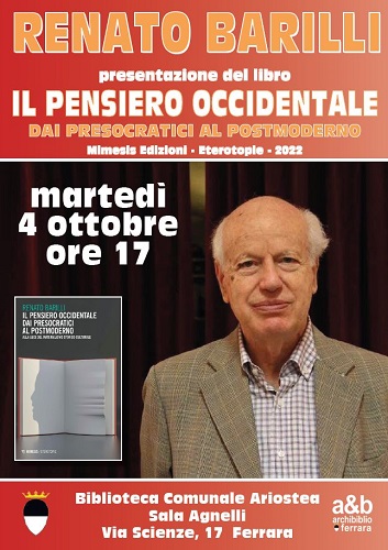 FERRARA – Ha per tema ‘Il pensiero occidentale dai presocratici al postmoderno. Alla luce del materialismo storico culturale’ il libro di Renato Barilli che martedì 4 ottobre 2022 alle 17 sarà presentato nella sala Agnelli della biblioteca comunale Ariostea (via Scienze 17 Ferrara). La presentazione potrà essere seguita anche in diretta video sul canale youtube Archibiblio web.