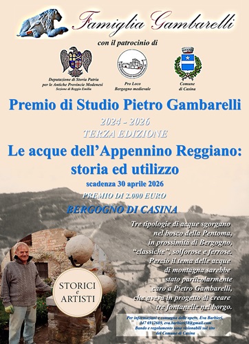 CASINA (RE) – Mesi cruciali per i partecipanti al premio di studio “Pietro Gambarelli”, con un riconoscimento per il vincitore di duemila euro, che entro aprile del prossimo anno dovranno consegnare i propri elaborati sul tema biennale “Le acque dell’Appennino Reggiano: storia ed utilizzo”.