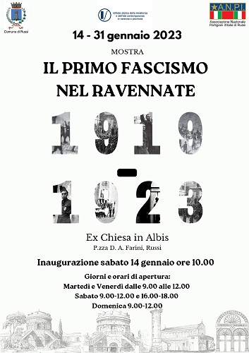 RUSSI (RA) – Da sabato 14 a martedì 31 gennaio 2023 l’ex chiesa in Albis (piazza D. A. Farini) ospiterà la mostra itinerante “Il primo fascismo nel ravennate 1919-1923”, realizzata dall’Istituto Storico della Resistenza di Ravenna in collaborazione con il Comune di Russi e ANPI Russi, voluta fortemente dall’Amministrazione comunale per ricordare il centenario dell’assalto alla sede della Federazione delle Cooperative di Ravenna.