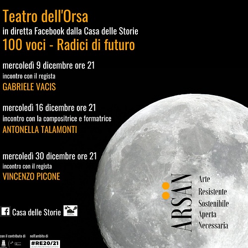 REGGIO EMILIA – Al via mercoledì 9 dicembre alle ore 21, con un dialogo online con il regista Gabriele Vacis sulla pagina Facebook della Casa delle Storie di Reggio Emilia (https://www.facebook.com/casadellestorie.orsa), il progetto ARSAN Arte Resistente Sostenibile Aperta Necessaria a cura del Teatro dell’Orsa.