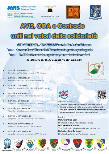 Cogliendo l’opportunità offerta dalle celebrazioni nel 2023 dei 100 anni dell’Aeronautica Militare Italiana, -celebrazioni caratterizzate dal motto “per la gente e con la gente” – Avis Ferarra ed Ente Palio, con il sostegno del Comune di Ferarra, hanno coinvolto il Gen. d. a. Claudio “Gab” Gabellini, Comandante del Comando Operazioni Aerospaziali (COA) -con sede a Poggio Renatico in provincia di Ferrara- quale principale relatore del ciclo d’incontri “Chiacchierate… “In Azzurro” con le Contrade di Ferrara” in cui “un pilota racconta le sue esperienze, sensazioni ed emozioni”.