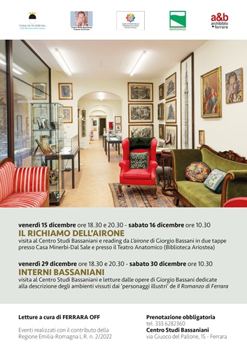 Le letture saranno curate da Ferrara Off, e l’iniziativa è promossa dal Comune di Ferrara, Servizio Biblioteche e Archivi, con il contributo della Regione Emilia-Romagna L. R. n. 2/2022. Il Centro Studi Bassaniani di Ferrara è stato riconosciuto dalla Regione con il marchio “Case e Studi delle Persone Illustri”.