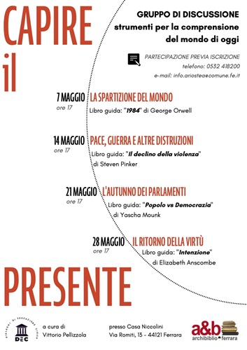 FERRARA – Mercoledì 28 maggio 2025 alle 17:00 la biblioteca comunale Casa Niccolini (via Romiti 13, Ferrara) ospiterà il quarto incontro del ciclo “Capire il presente” a cura di Vittorio Pellizzola. L’appuntamento, aperto al pubblico, segue un percorso di riflessione sugli strumenti necessari per comprendere la complessità del mondo odierno, nell’ambito dei “Dialoghi di educazione civica”.