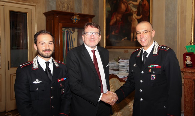 MODENA – “Grazie per il servizio prestato al servizio dei cittadini e per il contributo dato per la sicurezza a Modena e in bocca al lupo per i nuovi incarichi che vi apprestate a svolgere”. Nella mattinata di lunedì 3 settembre il sindaco Gian Carlo Muzzarelli ha salutato l’attuale comandante del Reparto operativo del Comando provinciale dei Carabinieri di Modena, tenente colonnello Domenico Cristaldi e il capitano Luca Di Niquili ugualmente in procinto di lasciare la città.