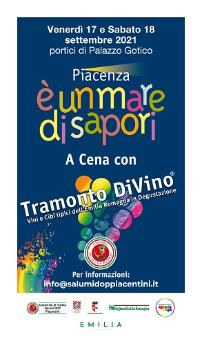 In occasione della sedicesima edizione di Tramonto DiVino, sette tappe in Emilia Romagna che propongono il meglio dell’enogastronomia regionale, il 17 e il 18 settembre, Piazza Cavalli di Piacenza diventa, invece, lo scenario d’eccezione in cui degustare i prodotti certificati DOP del territorio abbinati ai vini regionali per l’evento “Piacenza è un mare di sapori e Cena con Tramonto DiVino”. L’evento è organizzato dal Consorzio Salumi DOP Piacentini. Ai fornelli, uno Chef stellato che preparerà una cena degustazione – posti limitati 180 e prenotazione online – Dopo aver assaporato e aver esplorato il cuore storico della città, è d’obbligo un tour nella natura del Parco Fluviale del Trebbia. A Reggio Emilia, l’appuntamento con Tramonto DiVino è l’8 settembre 2021 in Piazza Martiri 7 luglio, con i prodotti tipici valorizzati dai cuochi dell’Associazione CheftoChef, i quali prepareranno una cena gourmet con vini abbinati dai sommelier. Protagonista della tappa reggiana sarà lo Chef Andrea Incerti Vezzani del Ristorante Ca’ Matilde di Rubbianino di Quattro Castella (1 Stella Michelin) che interpreterà tra gli altri prodotti il Cappelletto di Reggio Emilia e l’Erbazzone. In entrambe le tappe emiliane, saranno abbinate le delizie della gastronomia locale a circa 15 etichette, servite e raccontate dai sommelier di Ais Emilia e Romagna. Tra i prodotti protagonisti, i salumi DOP come la coppa piacentina, la pancetta e il salame piacentino, il Prosciutto di Parma, Il Parmigiano Reggiano e l’Aceto balsamico tradizionale di Reggio Emilia. Dopo gli antipasti, saranno servite tre ricette raccontate dal vivo da Carla Brigliadori, responsabile della Scuola di Cucina di CasArtusi.