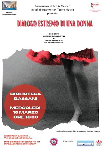 FERRARA – Mercoledì 16 marzo 2022 alle 18 la sala auditorium della biblioteca comunale Bassani (via Grosoli 42, zona Barco, Ferrara) farà da teatro al “Dialogo estremo di una donna” di e con Bruna Braidotti e Nicola Milan al pianoforte (Compagnia di Arti & Mestieri). L’evento è organizzato in collaborazione con il Teatro Julio Cortazar di Pontelagoscuro, nell’ambito della rassegna “Magnifiche Utopie” e in occasione delle iniziative per la Giornata internazionale della donna dell’8 Marzo.