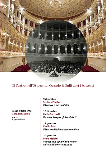 RIMINI – Un viaggio nel tempo in quattro tappe per conoscere la vita teatrale nell’Ottocento, ai tempi in cui si spalancarono per la prima volta le porte del Galli. Il Teatro nell’Ottocento. Quando il Galli aprì i battenti è il titolo del ciclo di conferenze che tra dicembre e gennaio propone un percorso di approfondimento sul significato dell’esperienza teatrale nell’epoca in cui Poletti consegnò alla città il suo imponente Teatro: una lente di ingradimento sul pubblico, sul ruolo del Teatro all’italiana nella società di quel tempo, sull’opera e la messa in scena, sul rapporto tra Rimini e il suo Teatro.