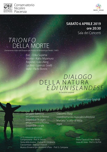 PIACENZA – Va in scena sabato 6 aprile alle ore 20.30 presso il Salone del Conservatorio Nicolini di Piacenza “Il trionfo della morte”, liberamente tratto da un oratorio inedito del 1685 di Bonaventura Aliotti. Lo spettacolo unirà la musica alla letteratura con la lettura del “Dialogo della Natura e di un Islandese” di Giacomo Leopardi. Un evento aperto al pubblico, libero e gratuito, traguardo di un progetto interdipartimentale che vede coinvolti numerosi studenti del Conservatorio piacentino.