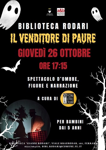 FERRARA – Aspettando Halloween, la biblioteca comunale Rodari attende i bambini dai 5 anni, giovedì 26 ottobre 2023 alle 17.15, per assistere assieme a “Il venditore di paure”, spettacolo d’ombre, figure e narrazione a cura di Officina Teatrale Actuar.