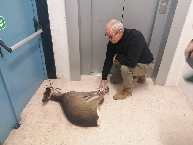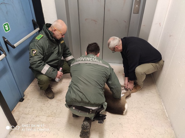 L’ungulato è stato avvistato dal personale scolastico davanti all’ascensore nell’atrio della scuola.