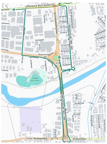 – per i veicoli provenienti dal Centro Città e diretti verso la zona Fiera di Rimini – Santarcangelo sarà necessario svoltare a sinistra all’altezza della rotatoria via Emilia – via Iolanda Capelli per percorrere via Bagli fino alla rotatoria con via Tonale e da qui immettersi sulla rotatoria SS16 – SS9.