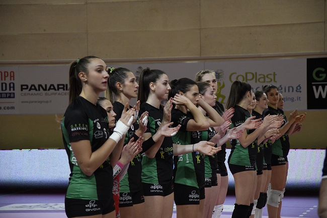 SASSUOLO (MO) – Non riesce nell’impresa la Green Warriors Sassuolo, che contro la Sigel Marsala cede 2-3: le neroverdi prima vanno sotto 0-2, poi crescono in attacco ed in difesa e si aggiudicano i due parziali successivi riaprendo così il match. Il tie break è equilibratissimo, poi Sassuolo riesce a rompere le righe e ad allungare 10-8. Tutto sembra ormai fatto, ma Marsala non ci sta e piazza il break con Pistolesi ed Okenwa (11-14): la Green Warriors tenta di nuovo l’impresa, annulla tre setball e pareggia 14-14. Nel finale però, due errori negano alle neroverdi il miracolo e le ospiti chiudono 14-16 e 2-3 nella conta dei set.