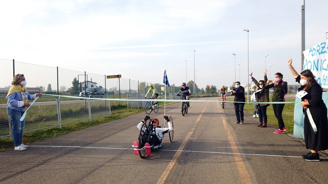 “Ad un certo punto speravo che avessimo sbagliato a contare i km ma ce l’abbiamo fatta tutti insieme – commenta Veronica Frosi -. Ringrazio tutte le persone che mi hanno sostenuto. Vedere e sentire chi pedalava dietro sacrificandosi per mantenere il mio ritmo al fine di spingermi idealmente in avanti oppure le persone che camminavano a bordo pista applaudendomi è stato straordinario. Il momento di maggior crisi sono stati i 35 km, mi facevano male molto le spalle e la testa avrebbe voluto cedere. Non ho mollato perché al mio fianco avevo a mio padre e il mio preparatore Enrico Olivieri dello Sport Center Parma che mi hanno continuato a spronare e dettare i tempi ma soprattutto non volevo deludere Alex, ad ogni km l’ho pensato e mi ripetevo le sue parole”.