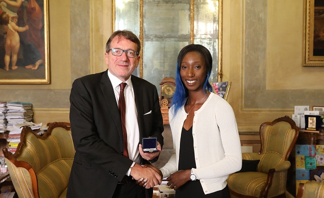 MODENA – Il sindaco Gian Carlo Muzzarelli ha incontrato in Municipio oggi, martedì 4 settembre, la velocista modenese Raphaela Lukudo che lo scorso giugno ha vinto la staffetta 4×400 ai Giochi del Mediterraneo a Tarragona, in Spagna, per poi partecipare anche agli Europei di Berlino.