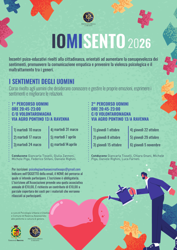 RAVENNA – Psicologia Urbana e Creativa APS in collaborazione con L’Amministrazione comunale Assessorato alle Politiche e Cultura di Genere attiva un percorso dedicato agli uomini che desiderano gestire le emozioni e la rabbia per diminuire la conflittualità, per migliorare le relazioni familiari e interpersonali con una maggiore consapevolezza dei sentimenti e l’utilizzo della comunicazione empatica.