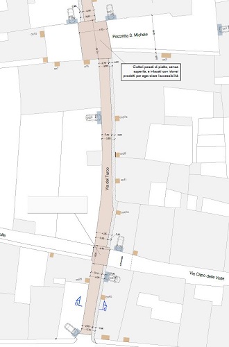 Nel tratto tra vicolo del Podestà e piazzetta San Michele, invece, il nuovo marciapiede in trachite avrà una larghezza di 100 cm. e le lastre saranno posizionate perpendicolarmente ai fabbricati con un cordolo, sempre in trachite, a coronamento del marciapiede.