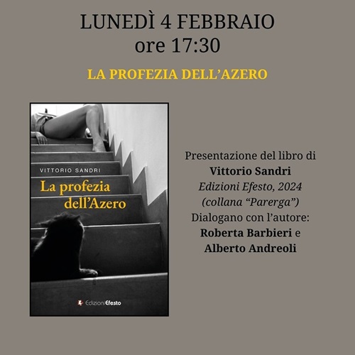 FERRARA – Si intitola “La profezia dell’Azero” (Edizioni Efesto, 2024) il nuovo romanzo di Vittorio Sandri che martedì 4 febbraio 2025 alle 17.30 sarà presentato nella sala Agnelli della biblioteca comunale Ariostea (via Scienze 17 Ferrara). Dialogheranno con l’autore: Roberta Barbieri e Alberto Andreoli.