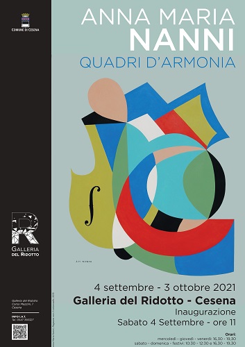 “Con sincera commozione – commenta il Sindaco di Cesena Enzo Lattuca – inauguriamo la mostra di Anna Maria Nanni, negli spazi della Galleria comunale d’Arte del Palazzo del Ridotto. È ancora vivo infatti il turbamento per la dolorosa scomparsa dell’artista. La sua volontà era che questa esposizione avesse comunque luogo, e anche senza di lei abbiamo convintamente corrisposto, ma certo Anna Maria ci mancherà, ci mancheranno le sue parole, il suo amabile raccontare di sé che abbiamo potuto apprezzare in altre precedenti occasioni espositive qui nella nostra città. Ricordandola con affetto potremo però ammirare le pitture scelte per questa mostra. Opere speciali, tutte ispirate alla musica e riunite sotto un titolo che risulta tanto più emblematico in questa circostanza, come quello di ‘Quadri d’armonia”.