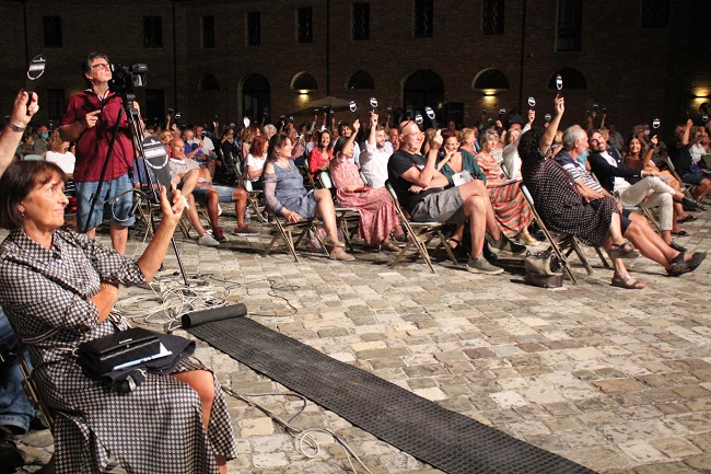SAN MAURO PASCOLI (FC) – Il Processo ai Vitelloni di Fellini finisce con un pareggio: senza condannati né assolti. È la prima volta che avviene nella storia ventennale dell’evento organizzato da Sammauroindustria. Il voto della giuria popolare per alzata di paletta ha sentenziato 219 voti per la condanna, altrettanti per l’assoluzione, in una platea di oltre 450 persone nella Torre pascoliana (numero dimezzato a causa delle normative sul distanziamento). Al presidente del Tribunale Gianfranco Miro Gori non è restato che constatare la parità ed emettere un “non verdetto”, fatto inedito per l’evento.