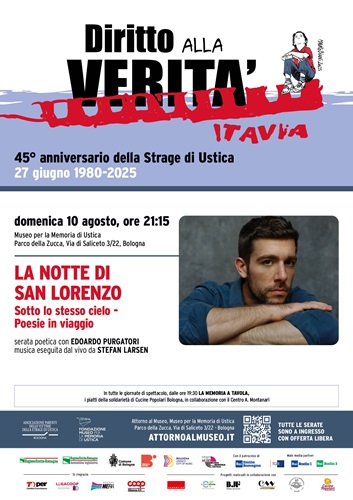 BOLOGNA – Le iniziative per il 45° Anniversario della Strage di Ustica termineranno domenica 10 agosto 2025 ore 21.15 attorno al Museo per la Memoria di Ustica con LA NOTTE DI SAN LORENZO