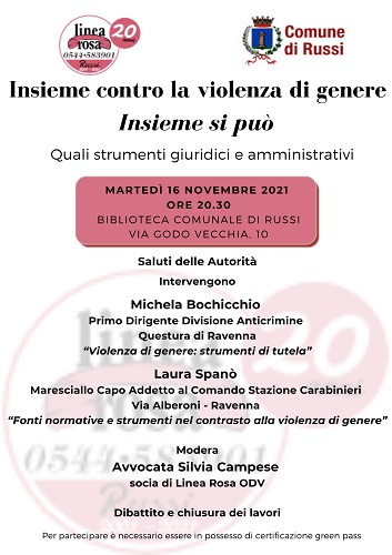 Martedì 16 novembre alle 20.30, nella Biblioteca Comunale di Russi, un incontro con Linea Rosa e le Forze dell’Ordine sugli aspetti giuridici e legislativi