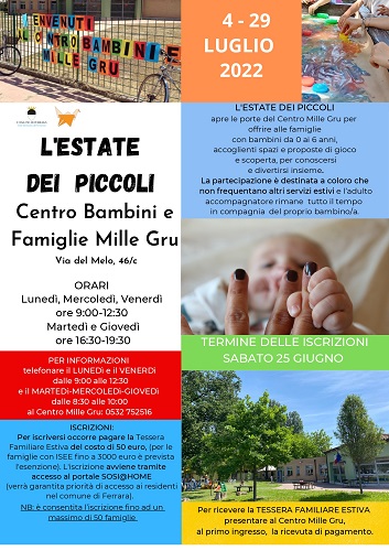 FERRARA – “L’Estate dei piccoli” è la proposta educativa di servizio estivo a cura del Centro Mille Gru per offrire alle famiglie con bambini da 0 ai 6 anni accoglienti spazi e proposte di gioco e scoperta, per conoscersi e divertirsi insieme da lunedì 4 a venerdì 29 luglio 2022 con appuntamenti quotidiani lunedì, mercoledì, venerdì ore 9-12.30; martedì e giovedì ore 16.30-19.30.