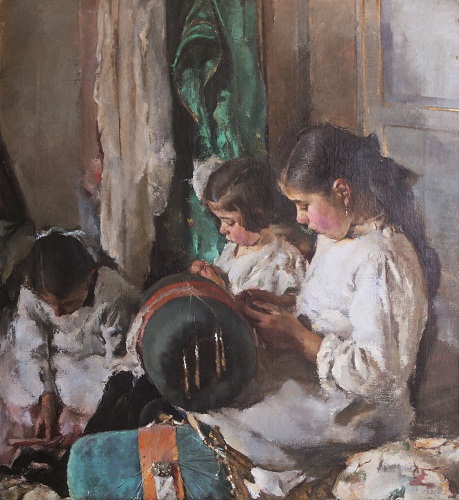 Giovanni Romagnoli, “Merlettaie [Scuola di ricamo]”, 1921, Olio su tela, cm. 100 x 90, Premio Baruzzi 1920