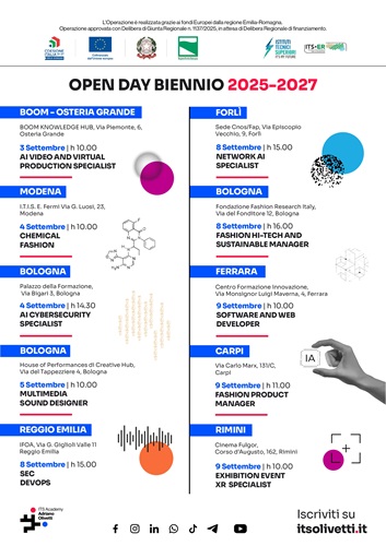 CESENA-BOLOGNA – Sono 21 i corsi biennali post-diploma che l’ITS Academy Adriano Olivetti propone per il biennio formativo 2025-27, tre in più dello scorso anno. Cresce ancora dunque l’offerta formativa della Fondazione che ha sede legale a Cesena e sede operativa a Bologna, e che è attiva in undici diverse località dell’Emilia-Romagna con percorsi ITS in ambito ICT e Fashion 4.0. La grande novità è la massiccia presenza di moduli dedicati all’Intelligenza Artificiale, che ha fatto irruzione in tanti settori dell’ambito ICT: dalla Cybersecurity al Marketing, dalla produzione audiovisiva allo sviluppo di web e reti.Le novità. L’offerta formativa dell’ITS Academy Olivetti è stata approvata dalla Giunta Regionale dell’Emilia-Romagna con delibera 1137 dello 14 luglio, e prevede, tra gli altri, cinque nuovissimi percorsi, che rappresentano delle novità assolute nel territorio regionale. A Rimini viene proposto il corso per Exhibition Event XR Specialist, una figura all’avanguardia, che opera nel campo della progettazione, realizzazione e gestione di eventi dal vivo, esperienze immersive e allestimenti multimediali, integrando creatività, tecnologie digitali e competenze organizzative. A Osteria Grande (BO) saranno proposti i corsi per AI Video and Virtual Production Specialist e per UI/UX Design Specialist, e a Bologna il corso per Multimedia Sound Designer. Nell’ambito della moda, invece, viene proposto a Modena il corso in Chemical Fashion, che punta a formare 25 professionisti che si occuperanno della chimica nella ricerca, nello sviluppo, nella gestione e nella produzione dei prodotti del sistema moda-tessile-abbigliamento. Si tratta di corsi che rispondono a nuovi stimoli arrivati dai territori e che hanno l’obiettivo di rispondere a fabbisogni formativi e occupazionali in costante evoluzione.
