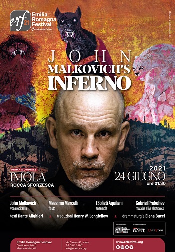 Giovedì 24 giugno 2021 (ore 21.30) presso la Rocca Sforzesca di Imola, il grande attore statunitense noto per essere un temerario nei labirinti umani, John Malkovich, con la complicità del flautista di fama e direttore artistico dall’intuito instancabile, Massimo Mercelli, del prestigioso ensemble de I Solisti Aquilani e del poliedrico Gabriel Prokofiev per la composizione delle musiche, proporrà un’interpretazione in chiave contemporanea delle intramontabili terzine dell’Inferno dantesco, restituendo sensazioni ed atmosfere del viaggio di Dante.