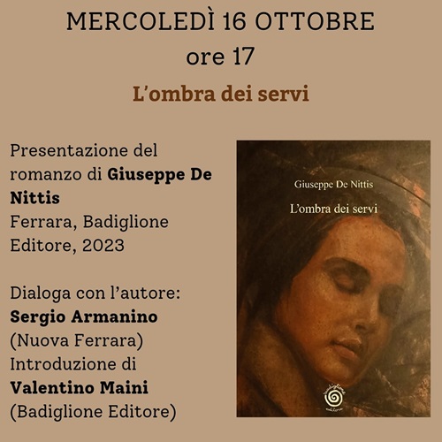 FERRARA – Racconta i percorsi paralleli di due gemelli divisi dagli accadimenti della vita, il romanzo di Giuseppe De Nittis “Lʼombra dei servi” (Ferrara, Badiglione Editore, 2023), che mercoledì 16 ottobre 2024 alle 17 sarà presentato nella sala Agnelli della biblioteca comunale Ariostea (via Scienze 17 Ferrara). Dialogherà con l’autore Sergio Armanino (Nuova Ferrara), con introduzione di Valentino Maini (Badiglione Editore).