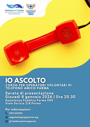 Telefono Amico Parma, il servizio totalmente anonimo e gratuito dell’Assistenza Pubblica Parma ODV, che da oltre 30 anni aiuta a supportare attraverso l’ascolto attivo chi si trova in una situazione di difficoltà, è alla ricerca di nuovi volontari, disposti a mettere a disposizione tempo, attenzione e capacità di ascolto per sostenere chi ne ha bisogno. Giovedì 8 gennaio 2026, alle ore 20.30, in Viale Gorizia 2/A, si terrà la serata di presentazione del nuovo corso per aspiranti operatori volontari.