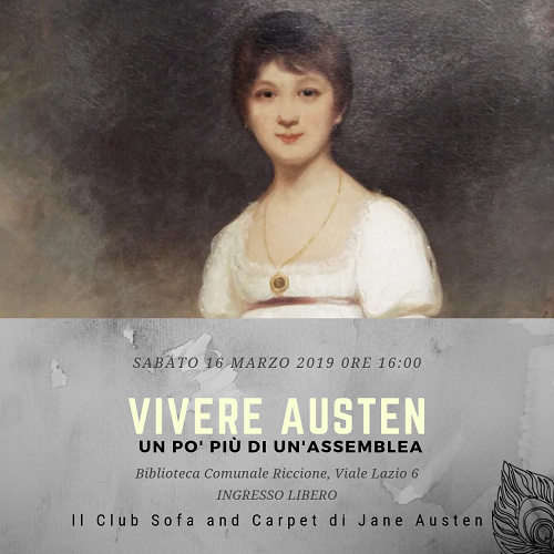 RICCIONE (RN) – Sabato 16 marzo, a partire dalle ore 16, la biblioteca comunale ospiterà un appuntamento particolare: l’associazione culturale Il Club Sofà and Carpet di Jane Austen si apre alla città e invita i curiosi e tutti gli appassionati di lettura a cogliere un assaggio dal mondo di Jane Austen, celebre romanziera inglese autrice, tra gli altri, di uno dei grandi classici della letteratura di tutti i tempi, Orgoglio e pregiudizio.