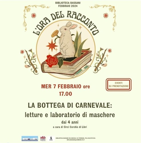 FERRARA – “L’ora del racconto” per i più piccoli torna anche a febbraio alla biblioteca comunale Bassani con tanti appuntamenti per i più piccoli dedicati alla narrazione, alla creatività e al carnevale da vivere assieme, con tutta la famiglia.