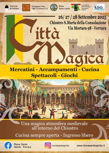 FERRARA – “La Città Magica 2025” è l’evento che prevede l’allestimento di un villaggio rinascimentale, ma anche mercatini, spettacoli, giochi e cucina nel Chiostro di Santa Maria della Consolazione (via Mortara 92, Ferrara) da venerdì 26 a domenica 28 settembre 2025. L’iniziativa, a cura del Rione Santo Spirito e con il patrocinio del Comune di Ferrara, è stata presentata lunedì 22 settembre nella sala degli Arazzi della residenza municipale.
