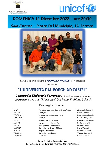 FERRARA – Teatro, divertimento e solidarietà andranno in scena con lo spettacolo teatrale “L’università dal borgh ad castel” della compagnia Squassa Marlet in programma per domenica 11 dicembre 2022 alle 20.30 nella Sala Estense (piazza Municipio 14, Ferrara). L’appuntamento, finalizzato a raccogliere fondi a favore dell’Unicef, è stato presentato lunedì 5 dicembre 2022 nella sala dell’Arengo della residenza municipale.