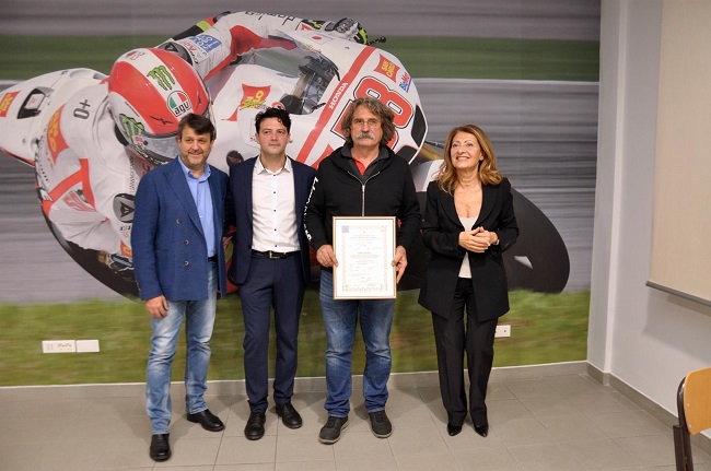 RIMINI – Paolo Simoncelli, accompagnato dall’ex fidanzata di Marco, Kate Fretti, non ha trattenuto l’emozione nel ritirare il diploma del figlio, prematuramente scomparso, al termine della commovente cerimonia che si è svolta ieri all’Istituto L. Battista Alberti di Rimini, durante la quale è stata dedicata l’Aula Magna dell’istituto al compianto ex allievo e grande campione di motociclismo. Marco Simoncelli, diplomatosi all’Alberti con 81 centesimi nel 2006, resta ancora nei cuori di tutti, professori e compagni: il padre Paolo ha colto l’occasione di ieri per ringraziare l’istituto anche per aver aiutato Marco a recuperare in breve tempo i suoi crediti, grazie ad uno staff ricco di umanità e competenza, e ha ricordato il figlio come uno studente meticoloso, preparato, sempre amichevole e disponibile con tutti. La cerimonia, condotta da Andrea Cicchetti, dopo i saluti della dirigente scolastica dell’Istituto Dott.ssa Alberta Fabbri, ha visto susseguirsi gli interessanti e coinvolgenti interventi degli ospiti: il docente dell’Istituto Ing. Roberto Rossi ha tracciato la storia dell’Alberti, che conta ormai 125 anni di attività, Sigfrid Stohr, ex pilota di F1 e titolare della scuola di pilotaggio Guidare e Pilotare, ha raccontato l’attitudine speciale ed unica dei romagnoli nei confronti delle due ruote, Livio Lodi, Curatore del Museo Ducati, ha raccontato divertenti aneddoti personali della sua amicizia con Paolo Simoncelli, e a seguire sono intervenuti anche Mattia Morolli, Assessore alla Scuola e Politiche Educative del Comune di Rimini, Mirco Muratori, Vicepresidente della Provincia di Rimini, Domenica Spinelli, Sindaco del Comune di Coriano, Prof. Giovanni Paolo Rossetti, ex DS dell’Istituto.