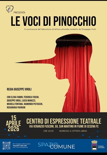 CESENA – Mercoledì 15 aprile, al Centro Arti Visive e Sceniche (via Fusconi 59, San Martino in Fiume) la Compagnia Fuori Scena porta in scena uno spettacolo intenso e coinvolgente: ‘Le voci di Pinocchio’, una lettura scenica tratta da ‘Le avventure di Pinocchio’. Storia di un burattino di Carlo Collodi, realizzata in occasione del bicentenario della nascita dell’autore.